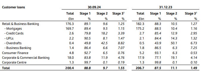 SAN UK is primarily a retail and commercial bank with the overwhelming majority of its assets and its liabilities in the UK. It is in fact heavily weighted towards UK mortgages as its 3Q24 accounts highlight. At 30th September 2024 SAN UK reported net loans of £200.4bn - comprising mortgages of £169.7bn (85%), and Corporate & Commercial Banking exposures of £18.0bn (9%) in the main (more detail in the table extracted from the 3Q24 accounts below) - and customer deposits of £185.7bn.