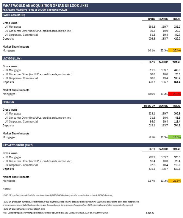There just a few potential ‘in-market’ acquirers who have the capacity to complete a transaction of this size - i.e., BARC, Lloyds (LLOY), HSBC (HSBA), Nationwide Building Society, and NatWest Group (NWG). While Coventry Building Society has also been touted in the media as a potential buyer I don’t think that its Board would seriously contemplate taking on a lender that is almost three times its size in terms of the loan book (for context, Coventry Building Society and Co-op Bank’s combined net loans came in just shy of £72bn at end-1H24) - not to mention the fact that management has its work cut out to ensure that the transformational Co-op Bank acquisition integrates well (despite the fact that Co-op Bank is run as a separate subsidiary). For the sake of completeness, an acquisition of SAN UK by Standard Chartered (STAN), while doable, would be entirely incongruent with the emerging markets-focused lender’s strategy.
