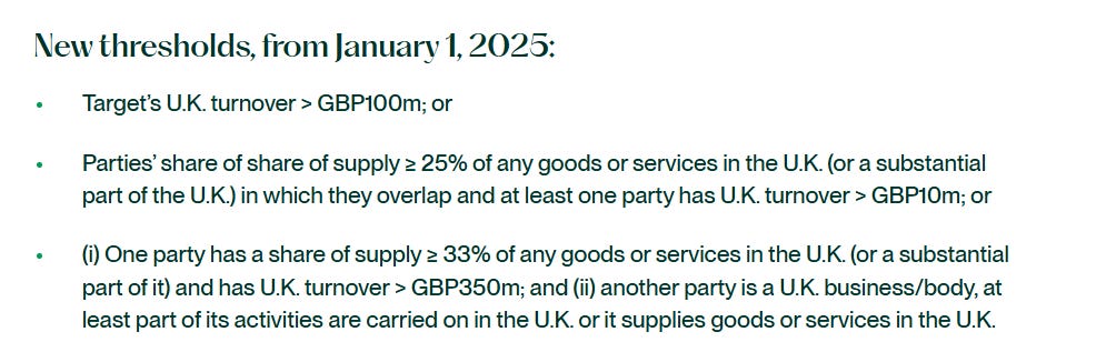 It is important to note that the UK Competition and Markets Authority (CMA) is the relevant body that reviews potential competition issues in mergers. New merger control thresholds were introduced on 1st January, as shown below (extracted from a useful note penned by the legal firm, A&O Shearman, here):
