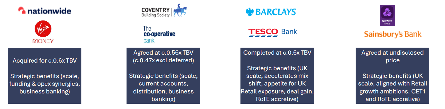 So, on average (using average consensus RoTEs over the three-year period FY24-26), the implied cost of equity (simplistically ignoring growth) for investing in these names is broadly in the region of 12.5% (BARC c.13.1%, LLOY c.11.8%, NWG c.12.4%). It’s not a precise science - I think the market has a slightly more bullish view on LLOY’s RoTE trajectory than consensus does, by way of an example. But, running with this number and applying it to SAN UK - and running with the argument that it’s a c.12% RoTE business means that SAN could theoretically get out at book value (i.e., c.1.0x TNAV). However, it is a sub-scale and monoline franchise relative to BARC, LLOY, and NWG. Indeed, given the multiples at which BARC is trading it realistically would have to strike a deal below book value in order for the transaction to be eps-accretive on a pre-synergies basis. The excerpt below from a recent presentation that I prepared illustrates the thin multiples at which a few select bank / portfolio acquisitions have been executed in the UK banking market in recent times (albeit all these businesses have different characteristics and all are different to SAN UK - so, it’s just an illustration). The point is that precedent transactions show that the domestic players only tend to acquire opportunistically at far lower multiples of book than 1x.