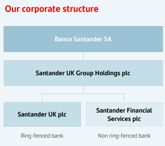 Santander UK Group Holdings plc is the UK holding company which is 100% owned by the parent, Banco Santander SA (SAN). Santander UK Group Holdings plc, in turn, owns 100% of the issued share capital in Santander UK plc (the ringfenced bank) and Santander Financial Services plc (the non-ringfenced bank) as the chart below, extracted from the Santander UK Group Holdings plc FY23 Annual Report attests to.