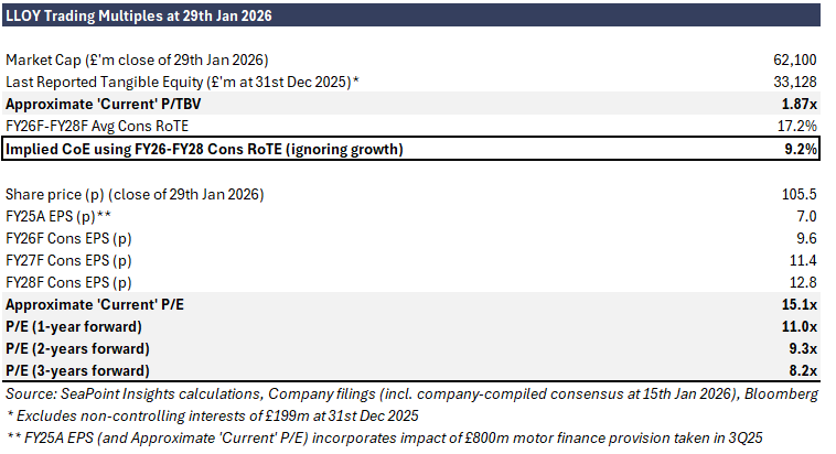 Of course there are many risks too - geopolitical shocks / a higher-than-expected rise in unemployment / a change in the PM or Chancellor all affecting the rate backdrop and the economic outlook, further remediation costs, investment spend requirements that turn out to be much higher-than-expected, etc. (I’m not setting out an exhaustive list by any means). But, all things considered, the consensus view is for a strengthening returns profile. Indeed, the market appears to have factored in this significant expected upside as well as the below simplified analysis of LLOY’s trading multiples and implied cost of equity (CoE) excl. growth attests to: