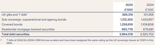 Indeed, Starling has moved up the risk curve to deliver lending growth (as its average loan asset yield of 6.75% in FY24 attests to) and is still struggling to recycle its deposits – with less than 30% of total assets represented by loans at year-end. While there are substantial cash balances sitting at central banks (£6.7bn), a further £3.9bn of (mostly excess) liquidity is sitting in investment securities with an average asset yield of 5.33% in the year – which Starling characterises as “low credit risk with credit ratings equivalent to the globally understood definition of investment grade”. It’s probably mostly high-quality stuff (see extracted table from p.129 of the Annual Report below) but it’s higher risk than Starling’s large bank peers would be running in these portfolios.