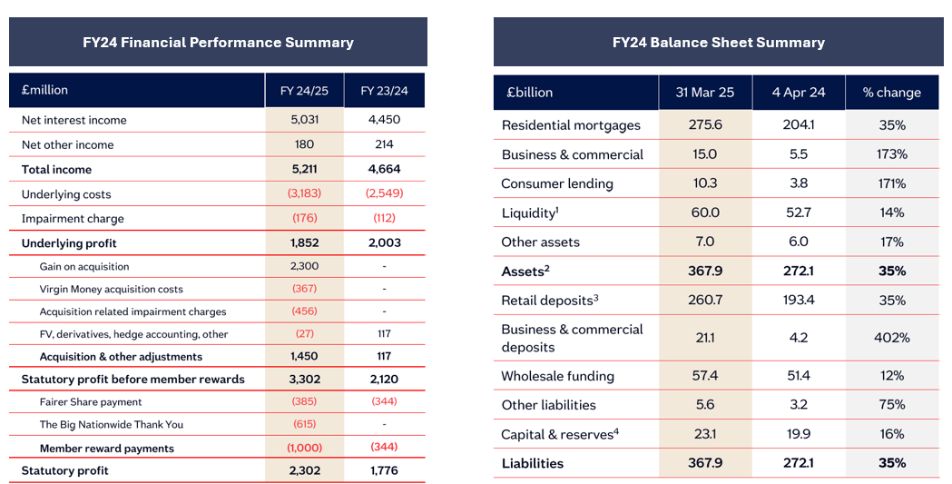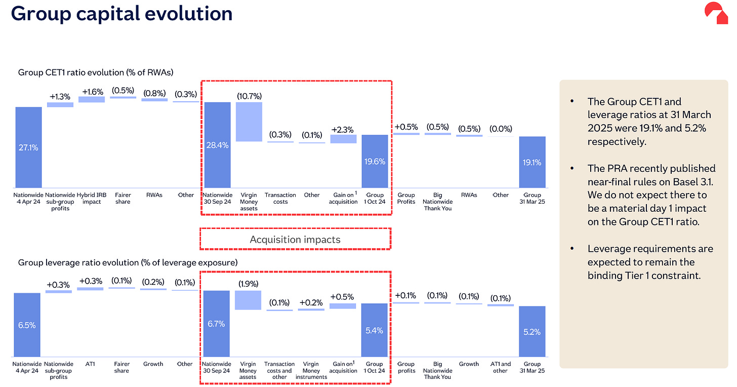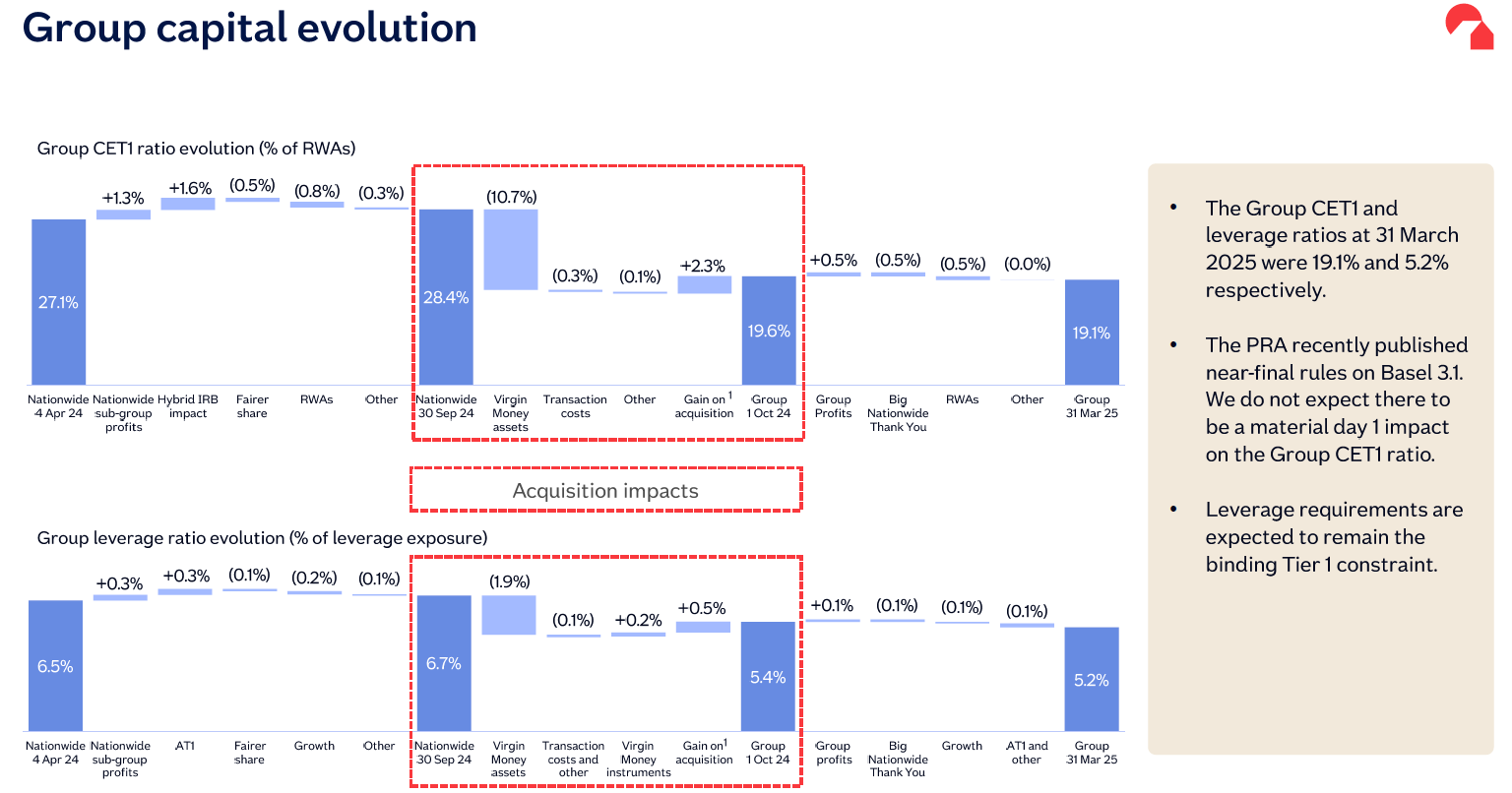 Nationwide acquired VMUK on 1st October 2024 for £2.8bn, which drove a substantial gain on acquisition of £2.3bn given Nationwide’s assessment of the fair value of assets acquired of £5.1bn (which embedded a net £410m of upward fair value adjustments to VMUK’s reported book value of £4.7bn).