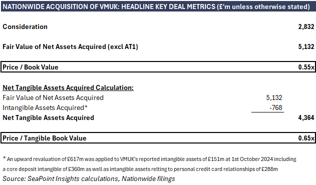 P.S.: Note 17 to Nationwide’s interim accounts for 2024/25 noted that “On 1 October 2024, Virgin Money UK plc and Virgin Enterprises Limited (‘VEL’) executed a Deed of Amendment and Restatement to the Trade Mark License Deed of Agreement originally dated 1 October 2014, as amended, restated and novated on 25 July 2016 and 18 June 2018. Pursuant to this Deed of Amendment and Restatement, the agreement will terminate after a four-year period, followed by a two-year cessation period, and Virgin Money UK plc has agreed to make payments to VEL totalling £250 million in addition to annual royalties during the remaining four-year term. These costs will be recognised within administrative expenses in the consolidated income statement, with the £250 million payment to be recognised in the period ended 31 March 2025 and the annual royalties recognised over the periods to which they relate. These future costs had already been articulated on page 21 of the Scheme Document of 22nd April 2024 (accessible here). Indeed, Nationwide took a charge of £275m in 2H24 to reflect in-period exit costs of £250m related to the amended Trade Mark License Deed of Agreement (TMLA) in addition to royalties. If we include this £250m as a cost of the acquisition given its size, unique nature, and immediacy post-transaction (which I appreciate is a highly debatable inclusion as the NPV of future royalty payments will be much reduced by virtue of the amended TMLA - and it is essentially just another cost of integration in any event), it would serve to nudge up the acquisition multiple of book value to 0.60x (from 0.55x) and the multiple of tangible book value to 0.71x (from 0.65x). So, in conclusion, no matter what way you look at it, the acquisition of VMUK represented a highly attractive deal for Nationwide’s members in my view.