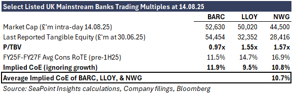 VMUK reported a RoTE of 9.1% in the six months to 31st March 2025 but had been trading at a substantial discount to tangible book value. Striking a deal to acquire a bank delivering a near-10% RoTE on a standalone basis with the added attraction of presenting Nationwide with material prospective synergies (net of integration / restructuring costs) for just 0.65x tangible book value (or 0.55x book value) was a great deal for Nationwide’s members in my view. Even if we forget the synergistic benefits, it represents an implied return on equity (ignoring growth and just running with the 9.1% RoTE) of c.14%. That compares very favourably to: i) current listed mainstream UK banks’ implied cost of equity (see table below - and, notably, NWG’s CFO remarked on the post-1H25 sell-side analysts roundtable on 30th July that management generally thinks about 11-12% as a hurdle rate) - which also ignores the material synergies that Nationwide should be capable of capturing; and ii) Santander’s recent agreed acquisition of TSB (notably, TSB reported a RoTE of 10.6% for FY24) at 1.45x TSB’s end-1Q25 tangible book value. Indeed, the deal also made much sense for VMUK’s shareholders given the deep discount at which VMUK had traded to book value for some time.