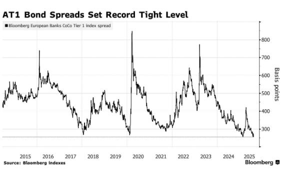 Two interesting articles on Bloomberg on AT1 spreads caught my attention this week. Firstly, Bloomberg reported on Monday here that veteran AT1 investors have begun to adjust their tactics - passing some deals and holding back cash to take advantage of market corrections - as the market becomes swamped with new buyers in an environment of “yield scarcity” to paraphrase Jeremie Boudinet at Credit Mutuel Asset Management, who is quoted in the piece. A second article on Bloomberg on Tuesday here zoned further elaborated on this topic, noting that the Bloomberg’s European Banks CoCo Tier 1 Index spread is at its lowest level ever (at just 255.2bps) since the instruments were created in 2014. Here is the chart, extracted from the referenced Bloomberg article: