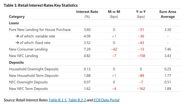 One point to flesh out is that, while new household term deposit rates are above the euro area average (1.88% versus 1.77%) and new NFC term deposit rates are below the euro area average (1.62% versus 1.89%), it is important to remember that the relevance of this from a banking sector net interest margin (NIM) perspective is extremely limited for two key reasons: i) the percentage of deposit stock attributable to term deposits in the Irish market is very low compared to other jurisdictions (over 90% of the listed banks’ deposit funding is represented by current accounts and demand accounts, i.e., overnight product); and ii) deposit churn (or flow to term) has been minimal (talking about deposit beta as rates come down is absolutely and utterly pointless in my view - just look at the absolute quantities of flow to term) and is clearly slowing. On my calculations, AIB Group (AIBG) and Bank of Ireland Group (BIRG) paid in the region of just c.25bps of their entire stock of deposits in 1H25.